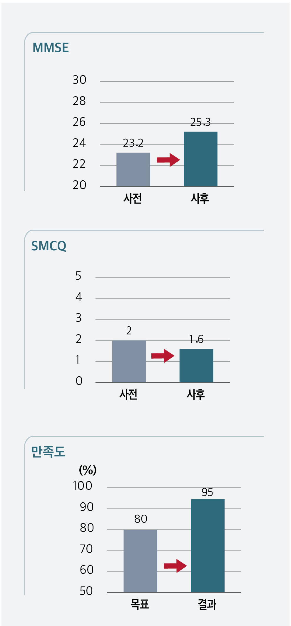 그 결과 치매 선별검사 MMSE가 23.2점에서 25.3점으로, 주관적 기억감퇴평가 SMCQ는 2점에서 1.6점으로 각각 개선됐다.