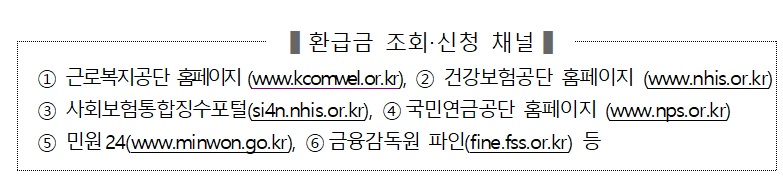 또한 국민이 환급금 발생 사실을 확인하고 싶거나 안내받은 환급금을 신청하기 위해 기관에 방문하지 않고도 인터넷(민원24 등), 고객센터(건강·연금 1577-1000, 고용·산재 1588-0075), 우편, 팩스 등 채널을 다양하게 운영해 환급금 신청 편의성을 높이는 한편 평균 이용도가 높은 국세청 등 유관기관의 홈페이지에서도 ‘보험료 환급금 찾기’ 배너연계 협업을 통해 신청 통로를 넓혔다.