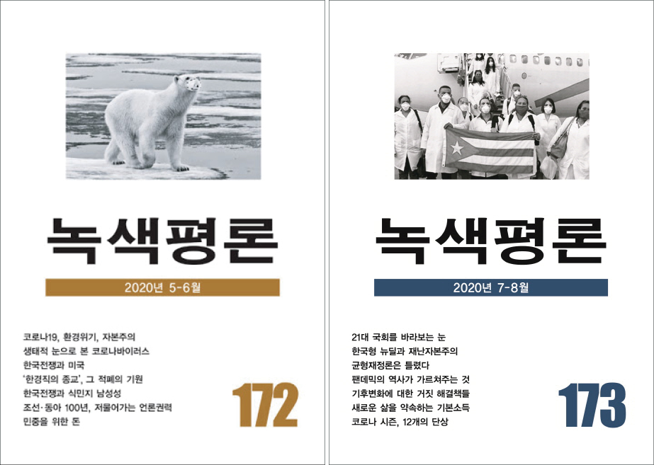 6월 말에 미리 배송이 된 『녹색평론』 7, 8월호의 목차를 보니 김종철 선생님의 『코로나 시즌, 12개의 단상』이 실려있었다. 그에 앞서 2020년 4월16일자 한겨레신문의 『김종철 칼럼』 “코로나 환란, 기로에 선 문명”에 다 못 쓰신 내용을 『녹색평론』으로 보완하셨겠다 싶은 반가운 마음에 칼럼과 평론집 글을 번갈아 읽게 되었다.