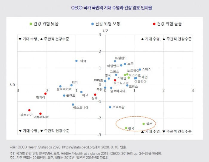 그러나 우리나라와 일본은 OECD 국가 중에서 건강 위험이 낮은 국가로 분류되고 있지만 기대 수명이 긴데도 건강 양호 인지율은 낮아 그 이유가 무엇인지 살펴볼 필요가 있다.