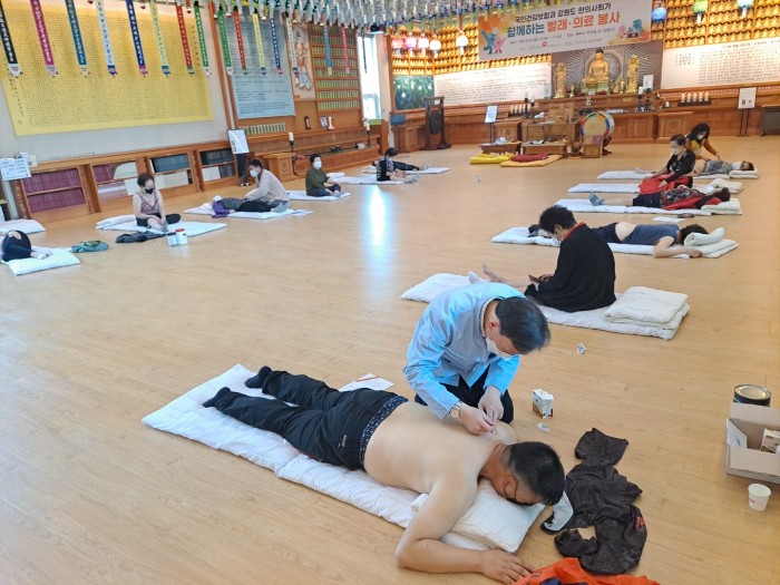 원주시 봉산동 소재 보문사에서 열린 이번 빨래·의료 봉사에는 강원도한의사회 오명균 회장·공이정 명예회장, 당유위 전 원주시한의사회장, 김하동 원장 등이 참석했다. 강원도한의사회 의료봉사단에서는 허남윤 단장, 정정이·서수정·육혁·김충열·홍유미 단원 등이 참여했다. 건보공단측에서는 정인영 지사장 등이 참석해 빨래봉사를 진행했다.