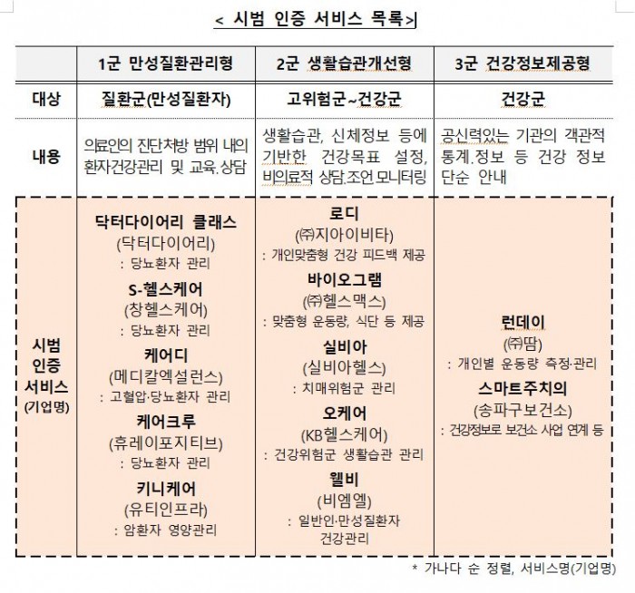 특히 1군으로 인증된 5가지 서비스의 경우 의원급 의료기관이 ‘일차의료 만성질환관리 사업’의 환자 관리 수단으로 활용할 수 있도록 연계 방안을 마련해 내년부터 시행한다.