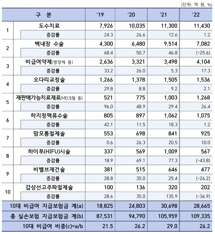 ▲ 2022년 주요 문제 비급여 지급보험금 통계(자료 : 이종성 의원실)