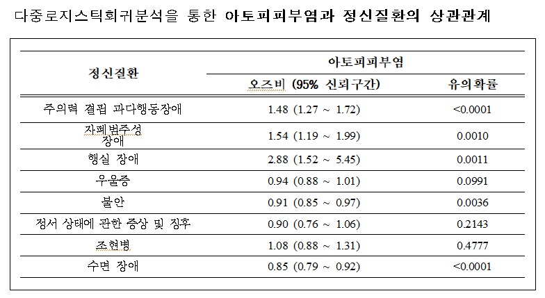또 정신질환에 대해 아토피피부염 환자들과 대조군인 비아토피피부염 환자들을 다중로지스틱회기분석을 통해 분석한 결과, 아토피피부염은 다른 피부질환보다 주의력결핍 과다행동장애(ADHD), 자폐범주성장애(ASD), 행실장애에서 높은 상관관계를 보이는 것으로 나타났다.