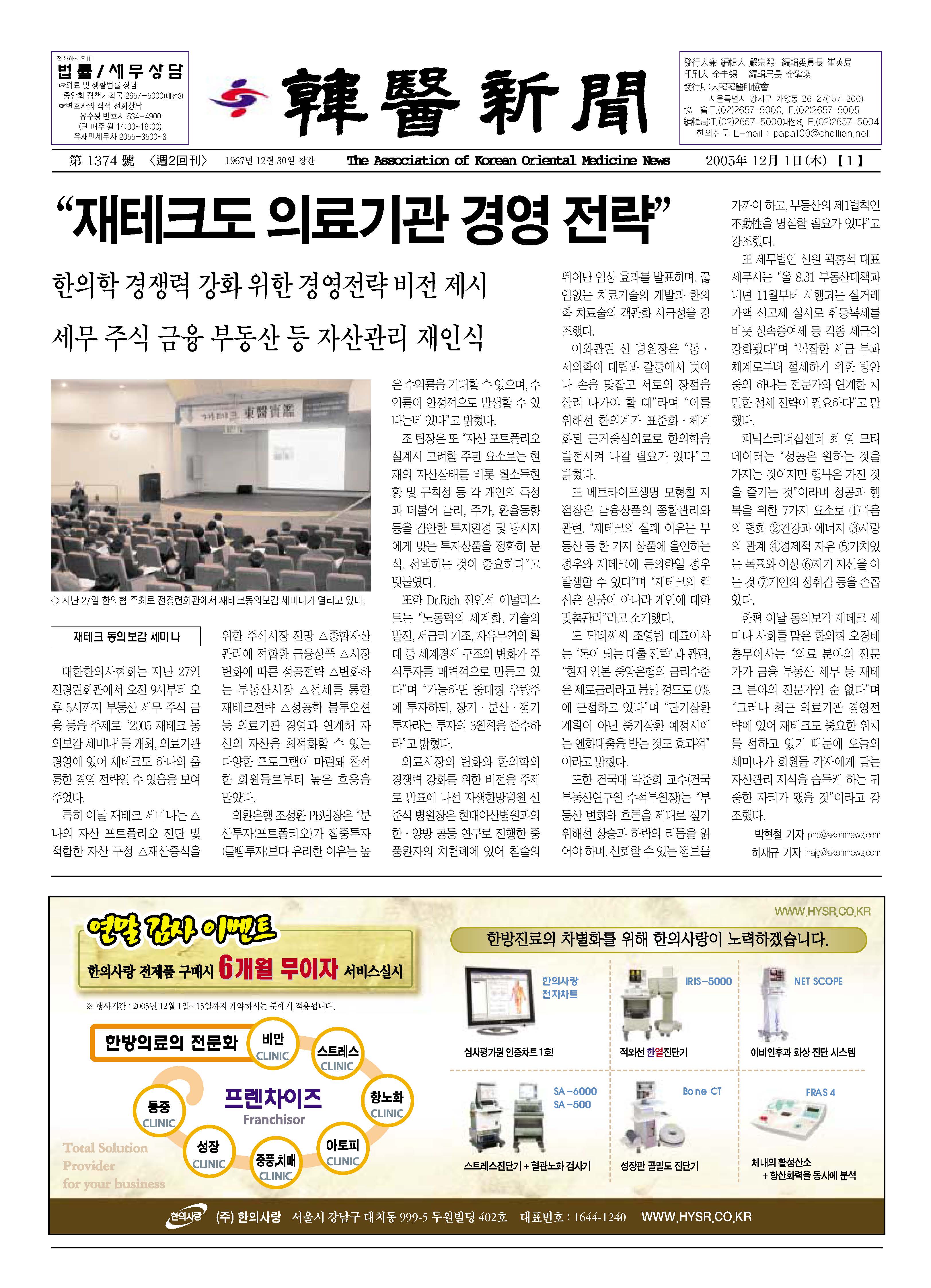 ///본문 대한한의사협회는 지난 27일전경련회관에서 오전 9시부터 오후 5시까지 부동산 세무 주식 금융 등을 주제로‘2005 재테크 동의보감 세미나’를 개최, 의료기관경영에 있어 재테크도 하나의 훌륭한 경영 전략일 수 있음을 보여주었다.
