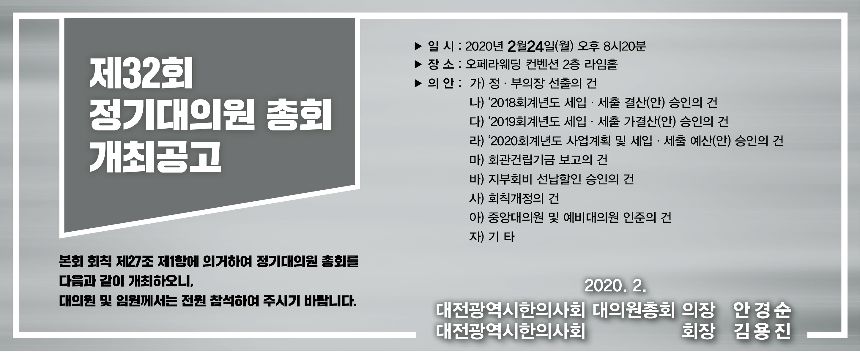 20/2/24 대전광역시한의사회 제32회 정기대의원 총회 개최공고 페이지 정보 작성자 한의신문 작성일20-02-18 11:10 조회5,480회 댓글0건 관련링크 이전글 다음글 목록 본문 댓글목록 등록된 댓글이 없습니다. 이전글 다음글 목록