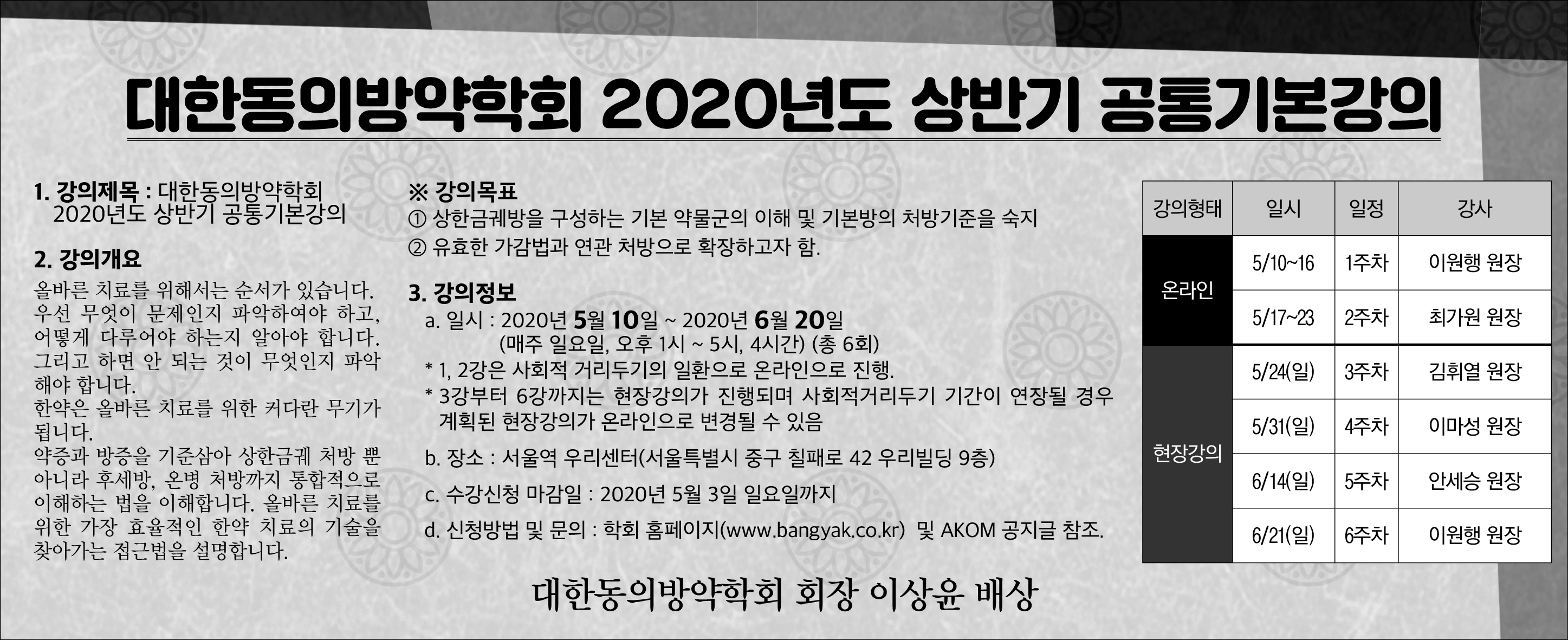20/5/10 대한동의방약학회 2020년도 상반기 공통기본강의 페이지 정보 작성자 한의신문 작성일20-04-27 14:53 조회5,381회 댓글0건 관련링크 이전글 다음글 목록 본문 댓글목록 등록된 댓글이 없습니다. 이전글 다음글 목록