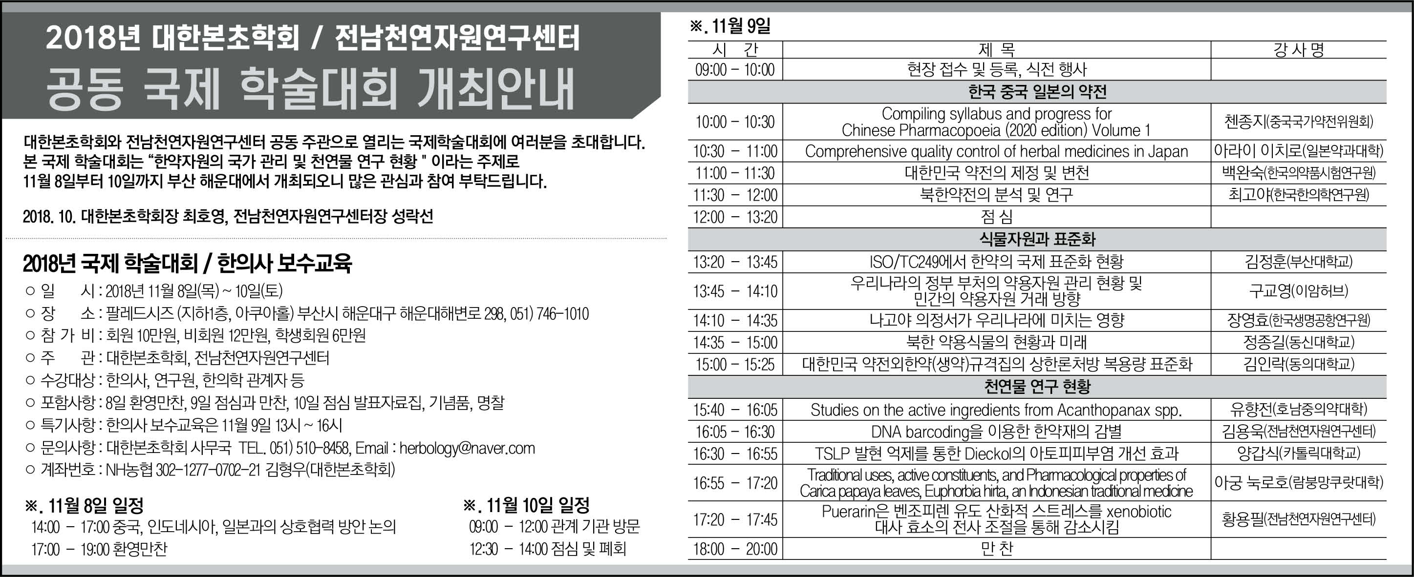 18/11/8 대한본초학회 / 전남천연자원연구센터 국제 학술대회 페이지 정보 작성자 작성일19-07-01 16:39 조회1,708회 댓글0건 관련링크 이전글 다음글 목록 본문 <아래 이미지를 클릭하시면 크게 보실 수 있습니다.> 댓글목록 등록된 댓글이 없습니다. 이전글 다음글 목록