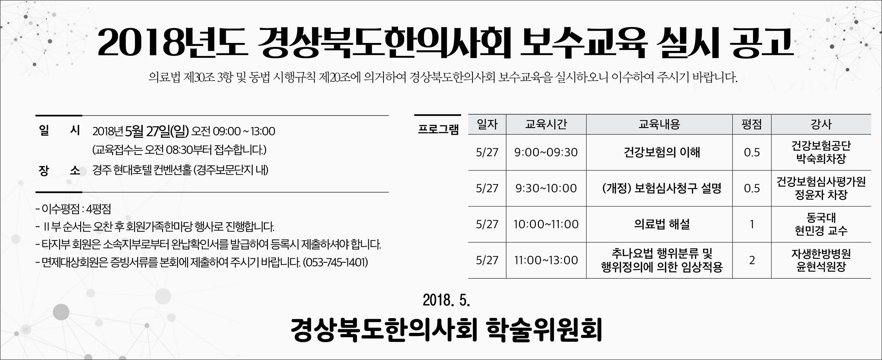 18/5/27 경상북도한의사회 보수교육 공고 페이지 정보 작성자 작성일19-07-01 16:39 조회1,916회 댓글0건 관련링크 이전글 다음글 목록 본문 <아래 이미지를 클릭하시면 크게 보실 수 있습니다.> 댓글목록 등록된 댓글이 없습니다. 이전글 다음글 목록