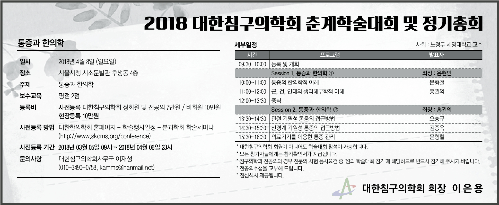 18/4/8 대한침구의학회 춘계학술대회 및 정기총회 페이지 정보 작성자 작성일19-07-01 16:39 조회1,600회 댓글0건 관련링크 이전글 다음글 목록 본문 <아래 이미지를 클릭하시면 크게 보실 수 있습니다.> 댓글목록 등록된 댓글이 없습니다. 이전글 다음글 목록