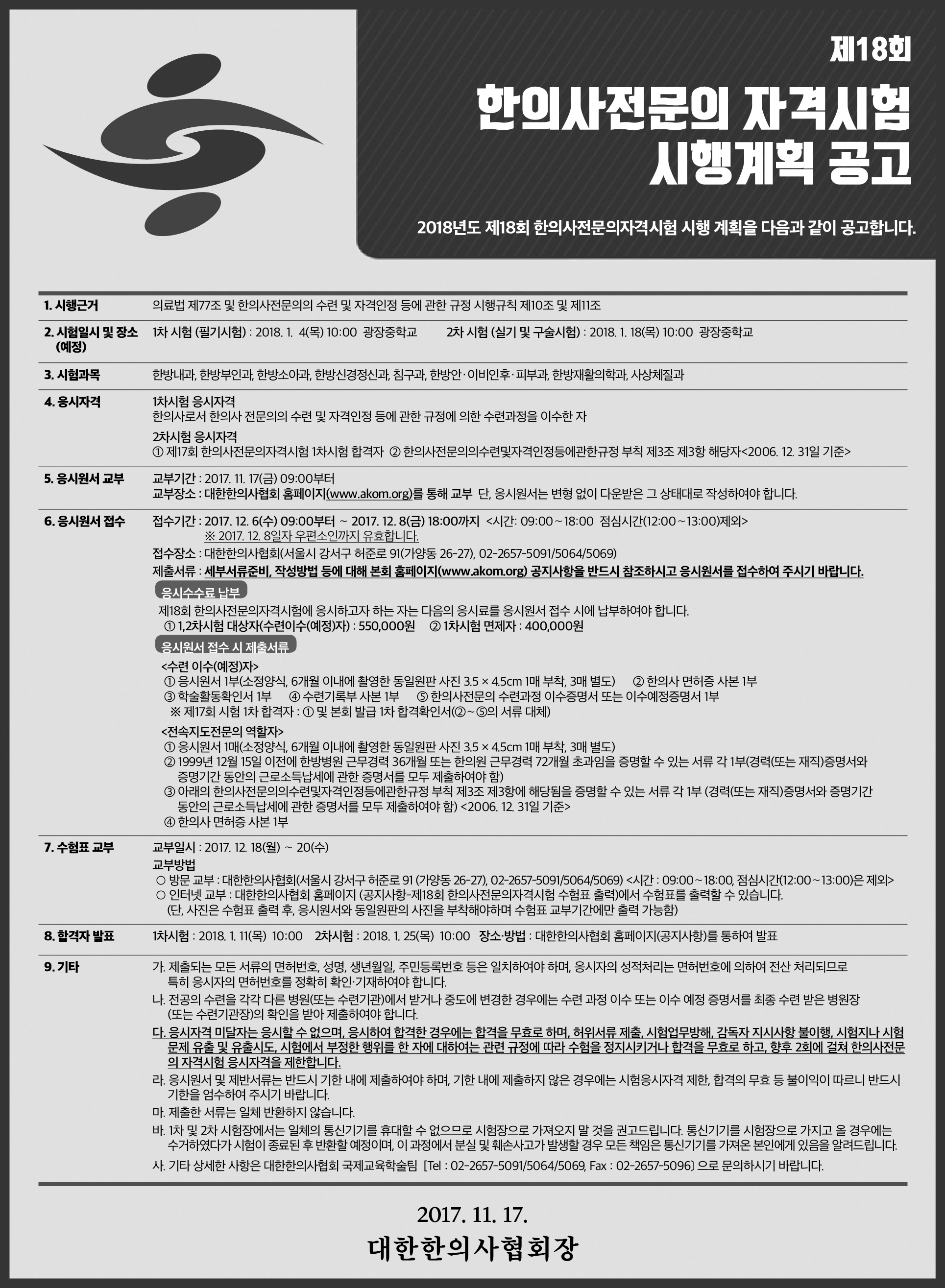 17/12/6~8 한의사전문의 자격시험 응시원서 접수 페이지 정보 작성자 작성일19-07-01 16:39 조회1,197회 댓글0건 관련링크 이전글 다음글 목록 본문 <아래 이미지를 클릭하시면 크게 보실 수 있습니다.> 댓글목록 등록된 댓글이 없습니다. 이전글 다음글 목록