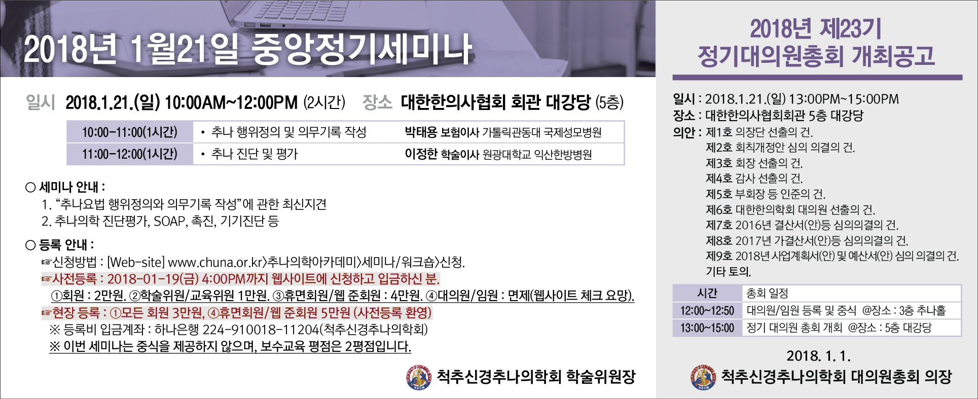 18/1/21 추나의학회 중앙정기세미나 및 정기총회 페이지 정보 작성자 작성일19-07-01 16:39 조회1,422회 댓글0건 관련링크 이전글 다음글 목록 본문 <아래 이미지를 클릭하시면 크게 보실 수 있습니다.> 댓글목록 등록된 댓글이 없습니다. 이전글 다음글 목록