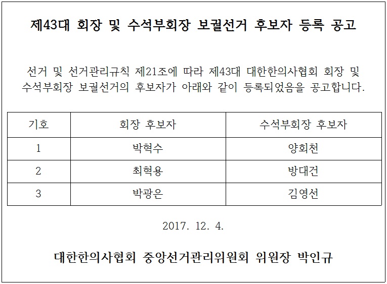 제43대 회장 및 수석부회장 보궐선거 후보자 등록 공고 페이지 정보 작성자 작성일19-07-01 16:39 조회1,597회 댓글0건 관련링크 이전글 다음글 목록 본문 댓글목록 등록된 댓글이 없습니다. 이전글 다음글 목록