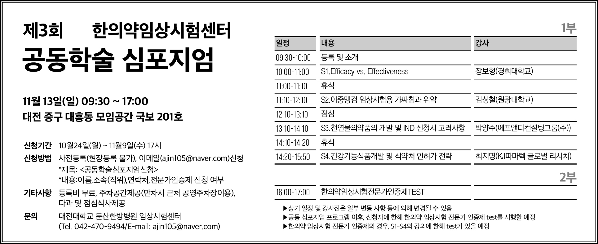 11/13 제3회 한의약임상시험센터 공동학술 심포지엄 페이지 정보 작성자 작성일19-07-01 16:39 조회812회 댓글0건 관련링크 이전글 다음글 목록 본문 <아래 이미지를 클릭하시면 크게 보실 수 있습니다.> 댓글목록 등록된 댓글이 없습니다. 이전글 다음글 목록