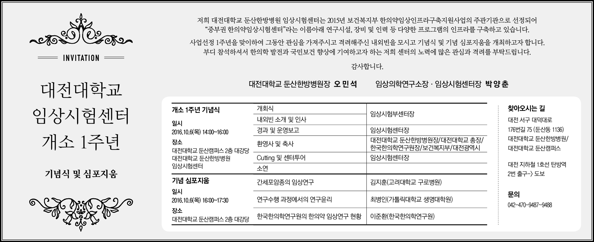 10/6 대전대임상시험센터 1주년 기념식 및 심포지움 페이지 정보 작성자 작성일19-07-01 16:39 조회1,063회 댓글0건 관련링크 이전글 다음글 목록 본문 <아래 이미지를 클릭하시면 크게 보실 수 있습니다.> 댓글목록 등록된 댓글이 없습니다. 이전글 다음글 목록