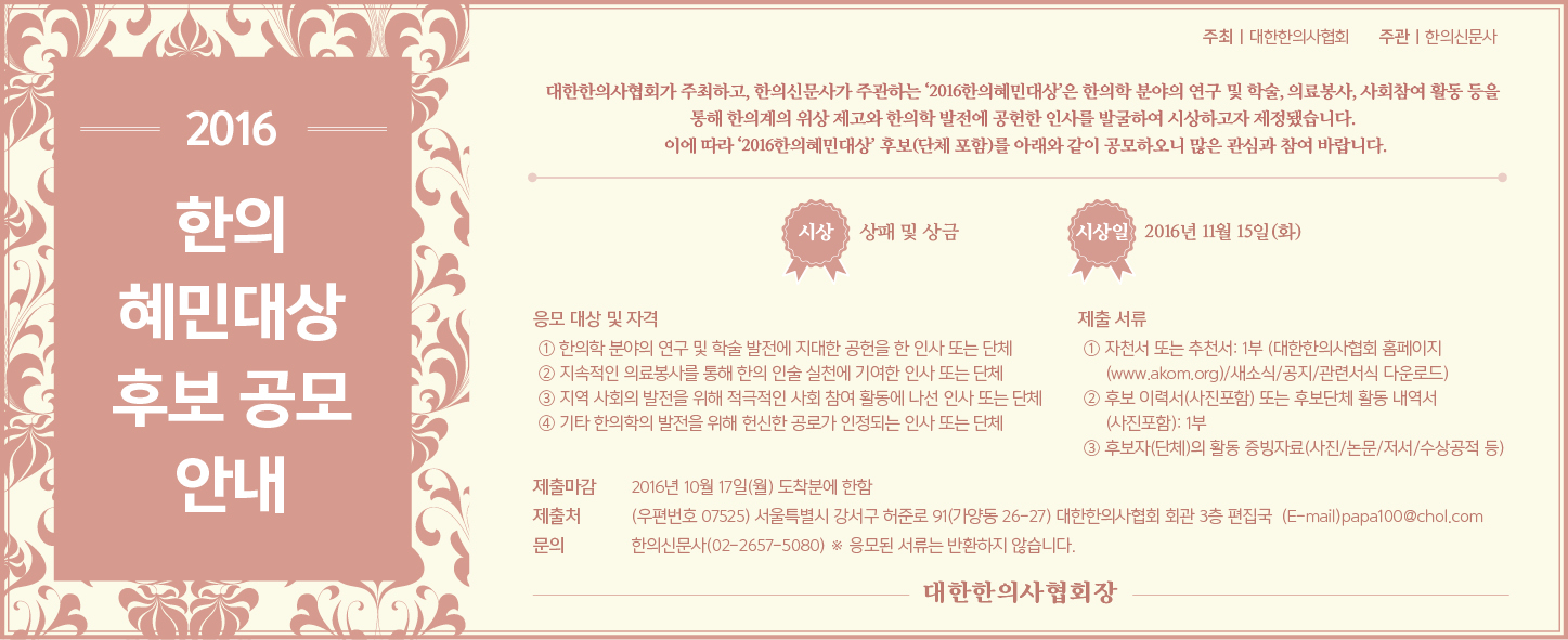~10/17 2016 한의혜민대상 후보 공모 페이지 정보 작성자 작성일19-07-01 16:39 조회842회 댓글0건 관련링크 이전글 다음글 목록 본문 <아래 이미지를 클릭하시면 크게 보실 수 있습니다.> 댓글목록 등록된 댓글이 없습니다. 이전글 다음글 목록
