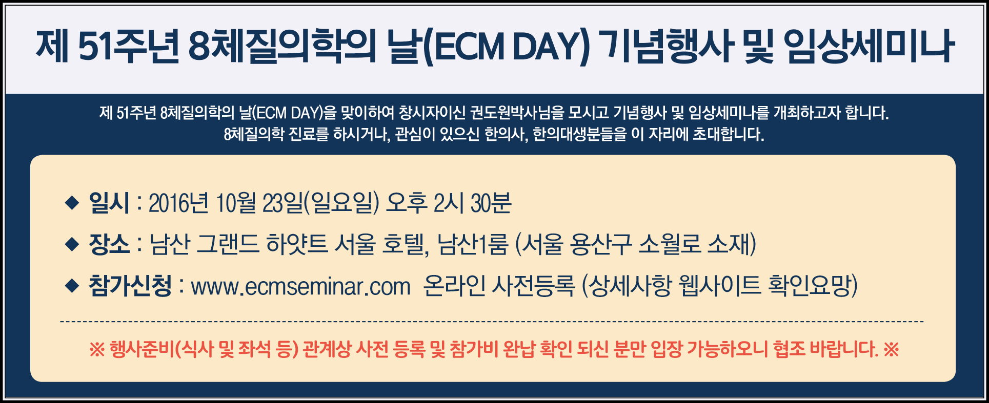 10/23 제51주년 8체질의학의 날 기념행사 및 세미나 페이지 정보 작성자 작성일19-07-01 16:39 조회907회 댓글0건 관련링크 이전글 다음글 목록 본문 <아래 이미지를 클릭하시면 크게 보실 수 있습니다.> 댓글목록 등록된 댓글이 없습니다. 이전글 다음글 목록