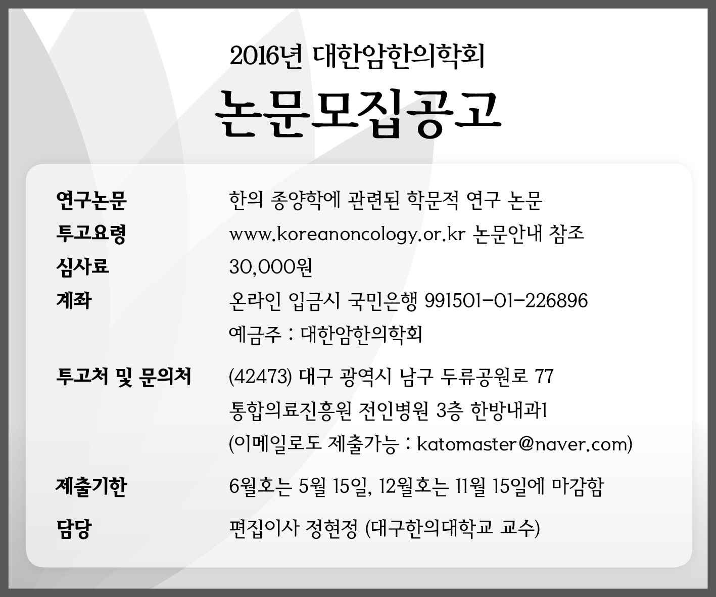 ~5/15 대한암한의학회 논문모집 페이지 정보 작성자 작성일19-07-01 16:39 조회834회 댓글0건 관련링크 이전글 다음글 목록 본문 댓글목록 등록된 댓글이 없습니다. 이전글 다음글 목록