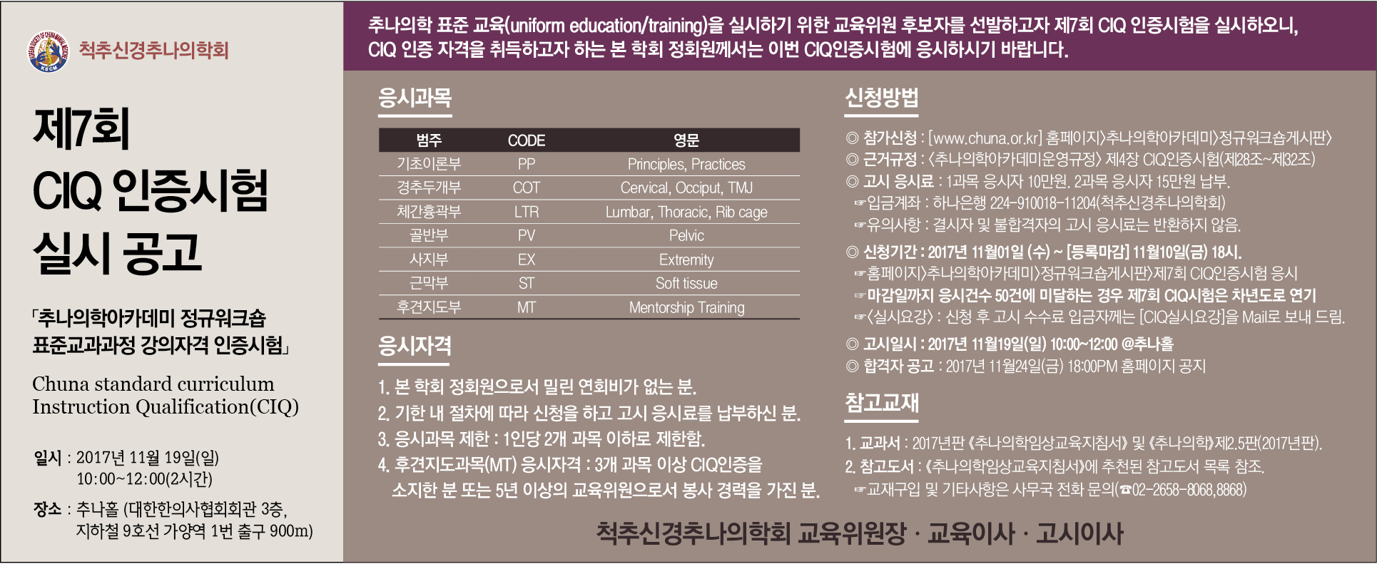 17/11/19 제7회 CIQ 인증시험(척추신경추나의학회) 페이지 정보 작성자 작성일19-07-01 16:39 조회1,445회 댓글0건 관련링크 이전글 다음글 목록 본문 <아래 이미지를 클릭하시면 크게 보실 수 있습니다.> 댓글목록 등록된 댓글이 없습니다. 이전글 다음글 목록